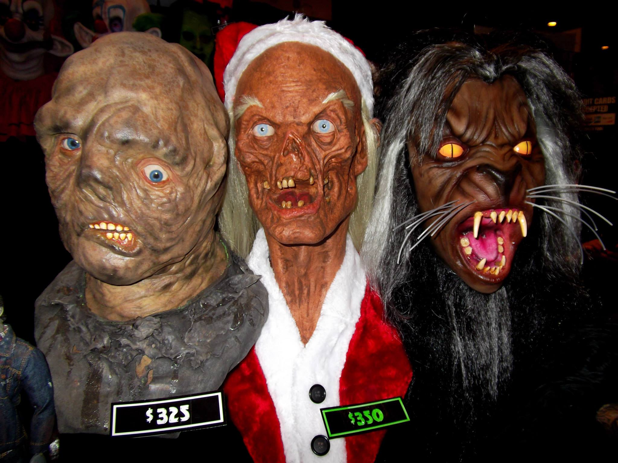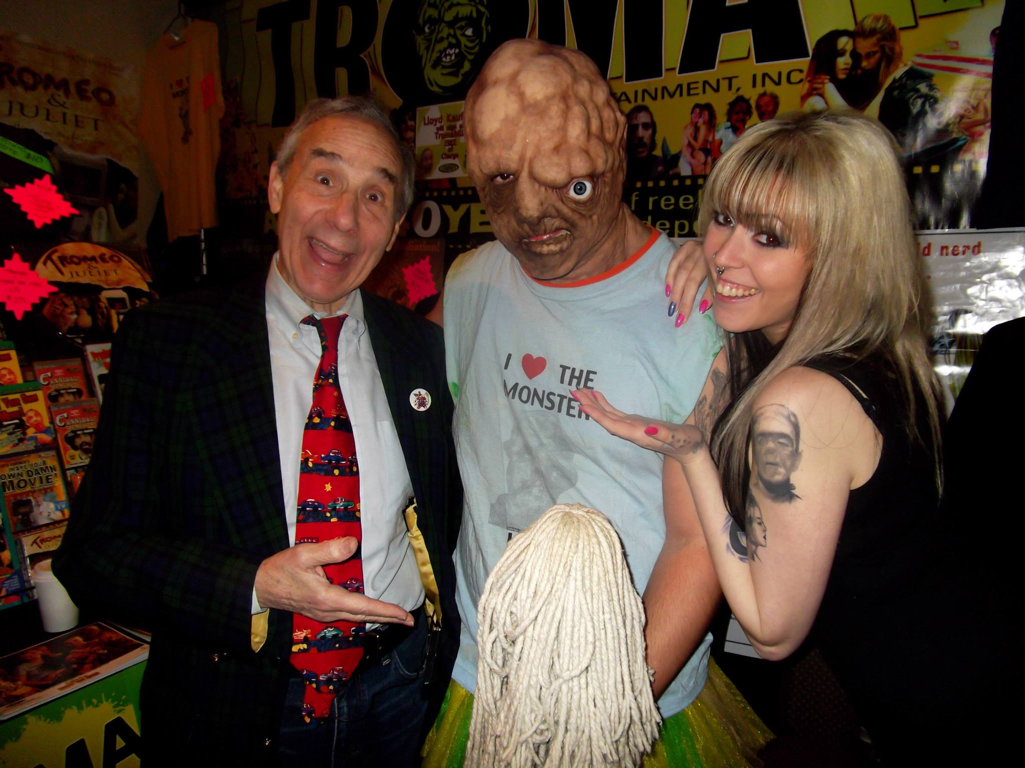 From left, American film director, producer, screenwriter and actor Lloyd Kaufman of Troma Entertainment, “The Toxic Avenger,” and a Tromette. (Photo by Domenic Mendez)Blood drenched horror mannequins (Photo by Domenic Mendez)People dressed in costumes. (Photo by Jay Kenney)Horror related items for sale at a vendor table. (Photo by Domenic Mendez)Showing off her costume (Photo by Domenic Mendez)